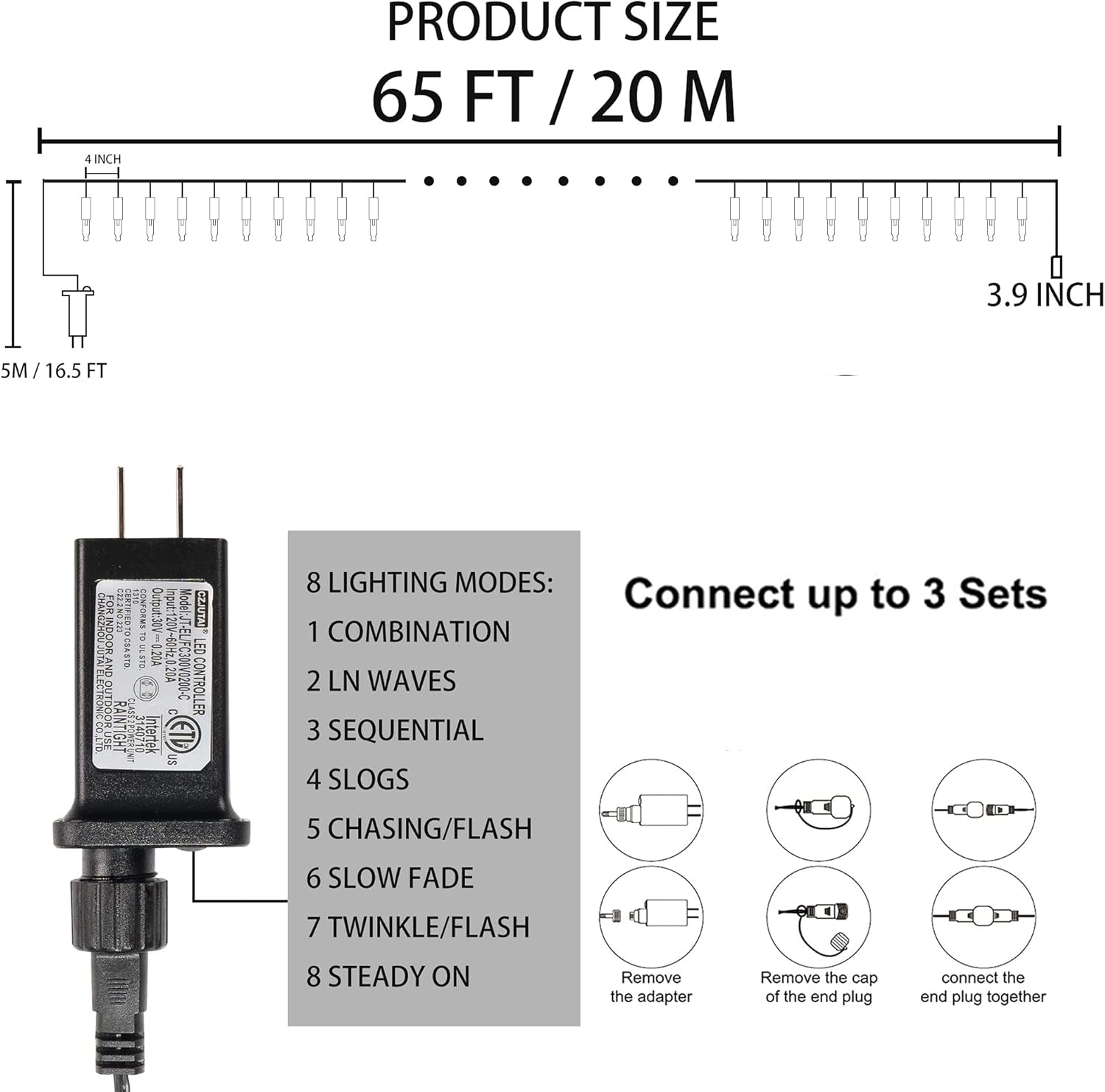 Built for safety and durability, the lights operate on 29V low voltage, ensuring energy efficiency and minimal power loss. With an IP44 waterproof rating, they withstand outdoor weather, while the plug-and-play switch makes setup simple. Crafted from high-quality materials, these lights shine brightly without overheating — ideal for long festive nights.