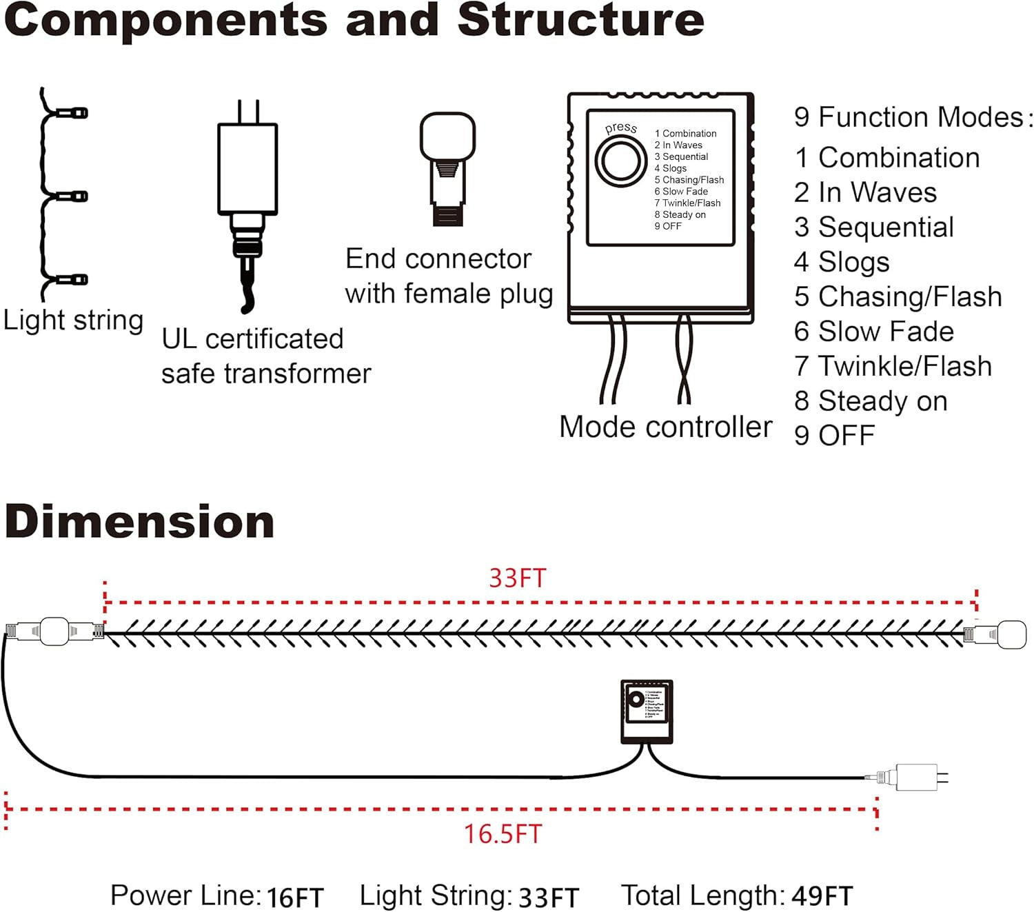 The 33FT 100 LED Halloween Black Wire String Lights feature 8 dazzling lighting modes—Combination, In Waves, Sequential, Slow Glow, Chasing/Flash, Slow Fade, Twinkle/Flash, and Steady On—so you can easily match your décor mood. Simply press the button on the adapter to switch between effects and add life to your Halloween parties, haunted houses, and seasonal displays.